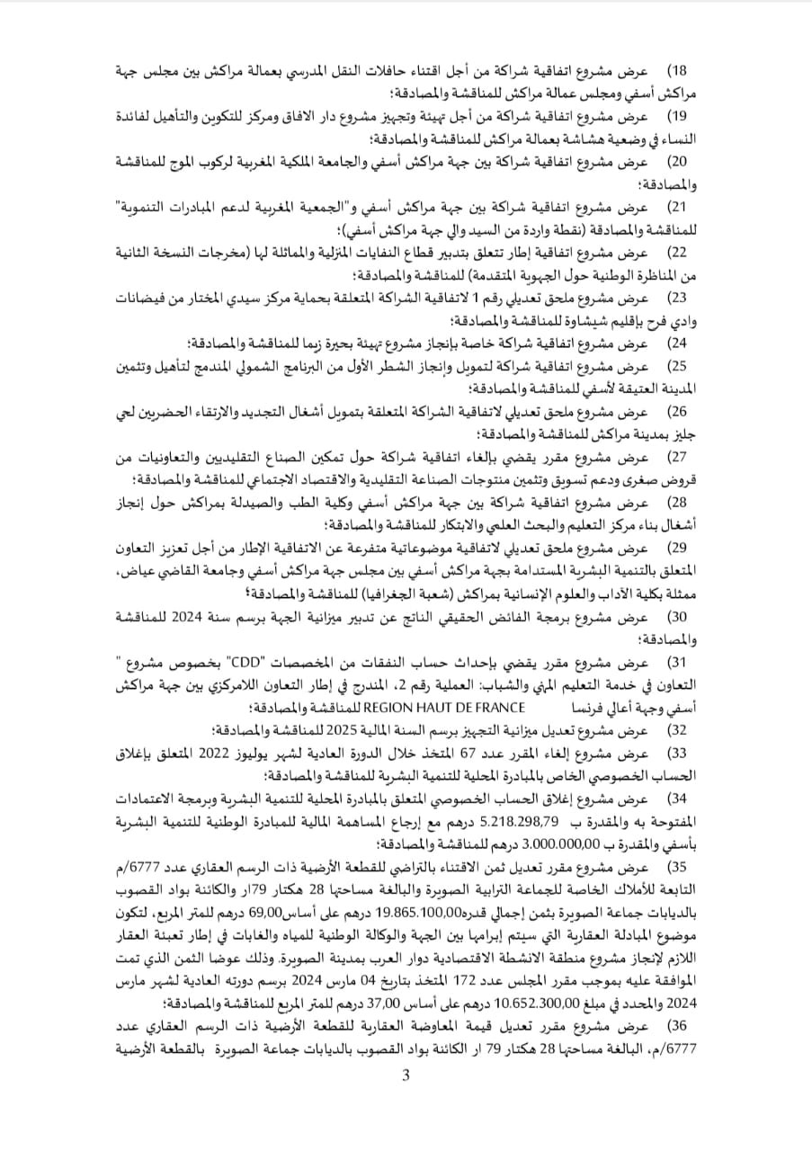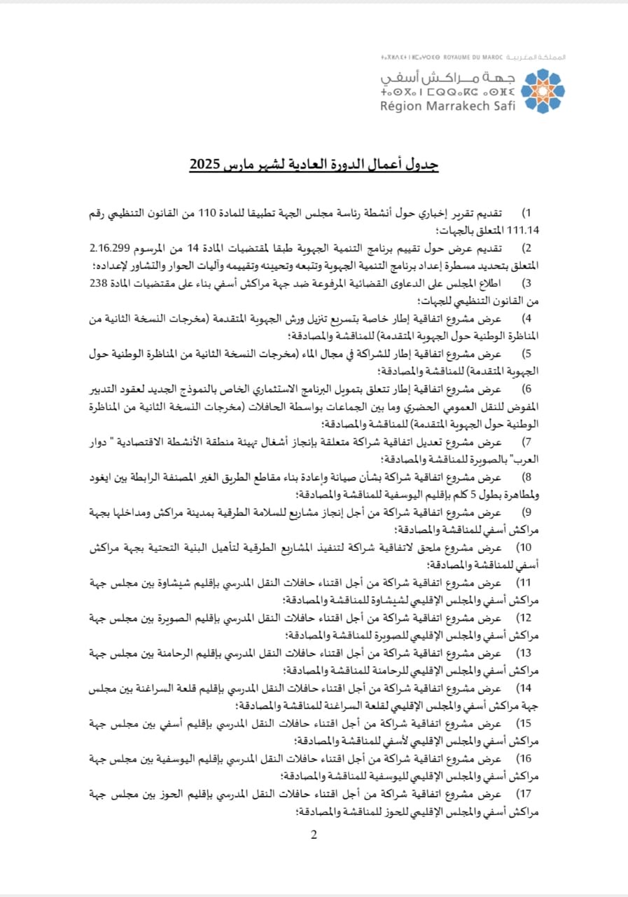 و من ضمن النقط التي من المفروض أن تستأثر باهتمام أعضاء المجلس تلك المتعلقة بعرض مشروع اتفاقية إطار تتعلق بتمويل البرنامج الاستثماري الخاص بالنموذج الجديد لعقود التدبير المفوض للنقل العمومي الحضري وما بين الجماعات بواسطة الحافلات مخرجات النسخة الثانية من المناظرة الوطنية حول الجهوية المتقدمة للمناقشة والمصادقة . فضلا عن نقطة عرض مشروع اتفاقية إطار للشراكة في مجال الماء مخرجات النسخة الثانية من المناظرة الوطنية حول (5 الجهوية المتقدمة للمناقشة والمصادقة.