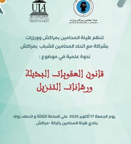 تنظم هيئة المحامين بمراكش وورزازات، بشراكة مع اتحاد المحامين الشباب بمراكش، ندوة علمية هامة حول موضوع: “قانون العقوبات البديلة ورهانات التنزيل”، وذلك يوم الجمعة 17 أكتوبر 2025 على الساعة الثالثة والنصف زوالاً، بفضاء نادي هيئة المحامين بتاركة – مراكش.