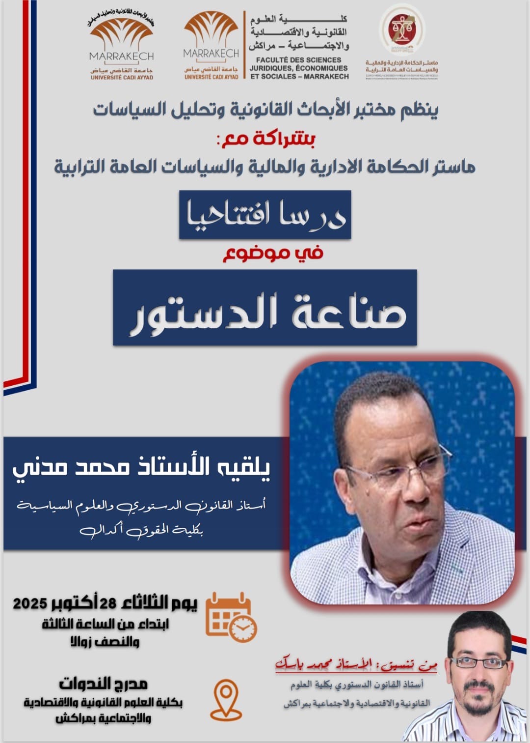 وسيُنسق أشغال هذا الدرس الافتتاحي الأستاذ محمد باسيك، أستاذ القانون الدستوري بالكلية ذاتها، حيث يُرتقب أن يشكل اللقاء فرصة للنقاش العلمي حول مفهوم صناعة الدساتير، وسياقاتها السياسية والقانونية، وأدوار الفاعلين والمؤسسات في صياغتها، بما يعزز فهم الطلبة والباحثين لمسار بناء الدولة الدستورية الحديثة